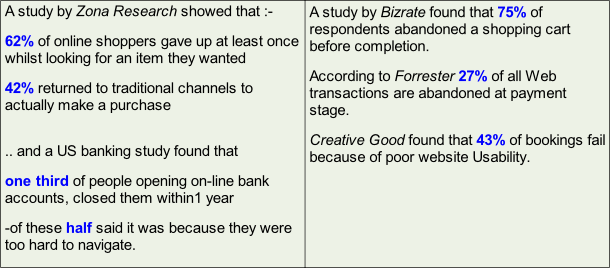Clearly there are other factors in the success of a website. Excellent usability cannot itself overcome a poor offering or lack of 'visibility' (.. talk to us about market focus and optimisation) .…